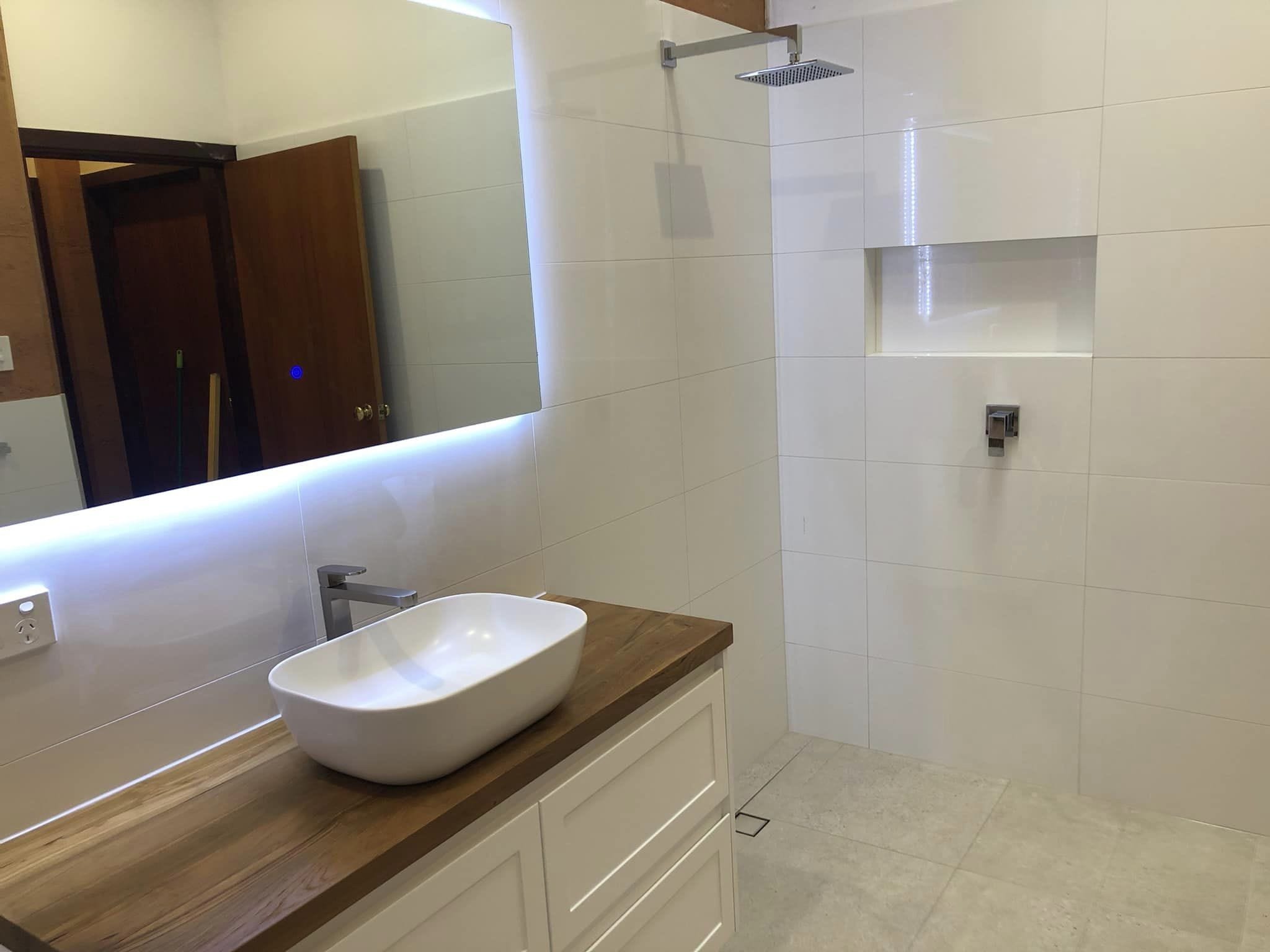 Back at Mofflin avenue Darlington This bathroom presented its challenges with the rammed earth, but the results are outstanding. 600/600 earthy tiles on the floor to match the earthy rammed earth. 300/600 on the walls.LJM Electrical WAGidgie Skips and RecyclingJ K F Plumbing and GasTitan TilingEnclosed bright silver shower screen to go in by S & R Glass